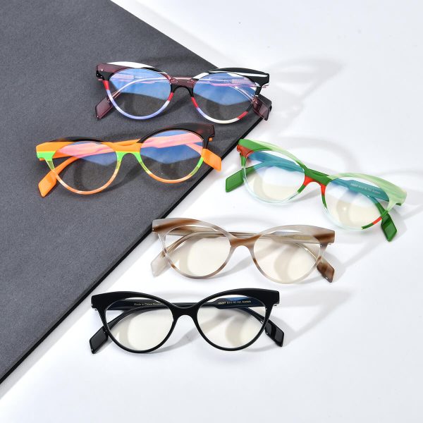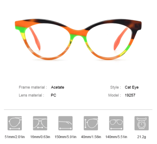 This brand-designed transparent acetate cat eye glasses frame combines fashion with functionality, ideal for those with myopia. Available in 5 captivating color options: pink, orange, green, black, and brown, catering to diverse personalities and fashion preferences. Its lightweight yet sturdy design ensures a comfortable wearing experience while accentuating personal taste and the allure of the fashion brand. Whether for everyday wear or professional occasions, this eyewear frame adds a touch of sophistication to your look, allowing you to exude charisma.