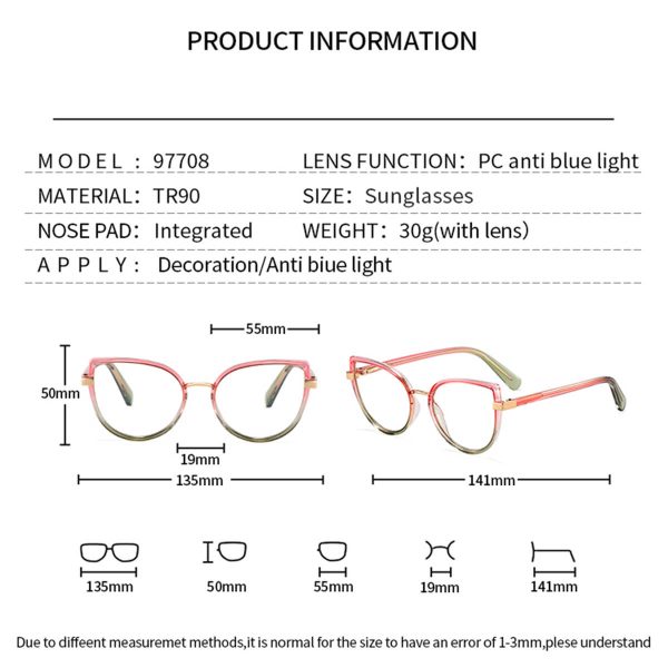 Ethan’s fashionable TR90 cat eye glasses combine classic and modern design seamlessly. Made with lightweight and durable TR90 material, these glasses provide comfort for the wearer. The cat eye shape showcases elegant lines, highlighting personality and style. Whether paired with formal attire or casual outfits, these glasses add a touch of chic to Ethan’s look