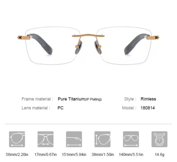 This new pure titanium glasses frame features a square design, providing a stylish option for men. The rimless design exudes a minimalist aesthetic, suitable for those with myopia. Made of pure titanium, the frame is lightweight, durable, and exceptionally comfortable, making it an ideal choice for daily wear. Whether for work or leisure, it showcases refined taste.