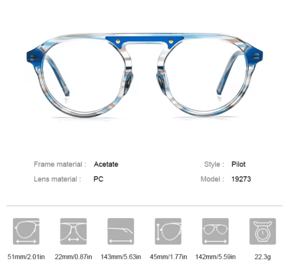 Introducing the Acetate Optical Glasses Frame for 2023 – a captivating blend of vintage and retro styles, reminiscent of classic pilot eyewear. Crafted with precision and attention to detail, this frame exudes timeless elegance and sophistication. Whether you’re seeking a bold fashion statement or a subtle nod to nostalgia, these prescription spectacles are designed to elevate your eyewear game. Step into the future with a touch of vintage charm, and embrace the allure of these iconic frames.