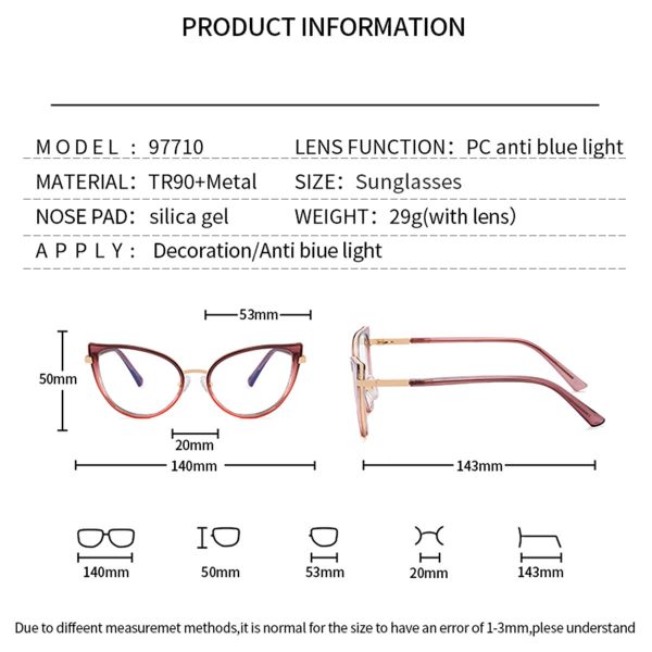 The Matthew TR90 Metal Cat Eye Glasses are a perfect blend of fashion and functionality. Crafted from high-quality TR90 material, they are lightweight yet durable, ensuring comfortable wear and withstanding the rigors of daily use. The metal cat eye frame design exudes an elegant and stylish vibe, adding a touch of sophistication to your look. Whether paired with casual attire or formal wear, these glasses elevate your appearance, showcasing personality and taste.