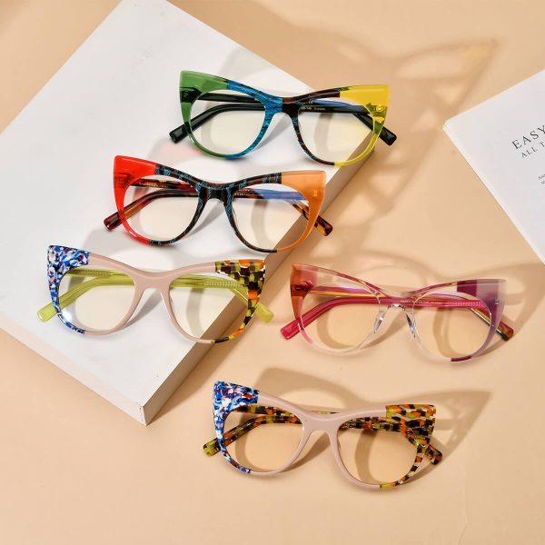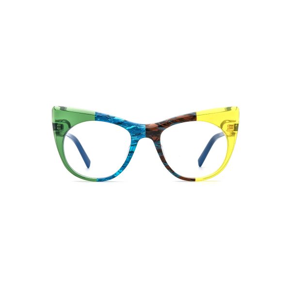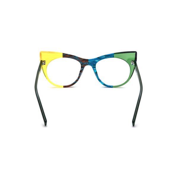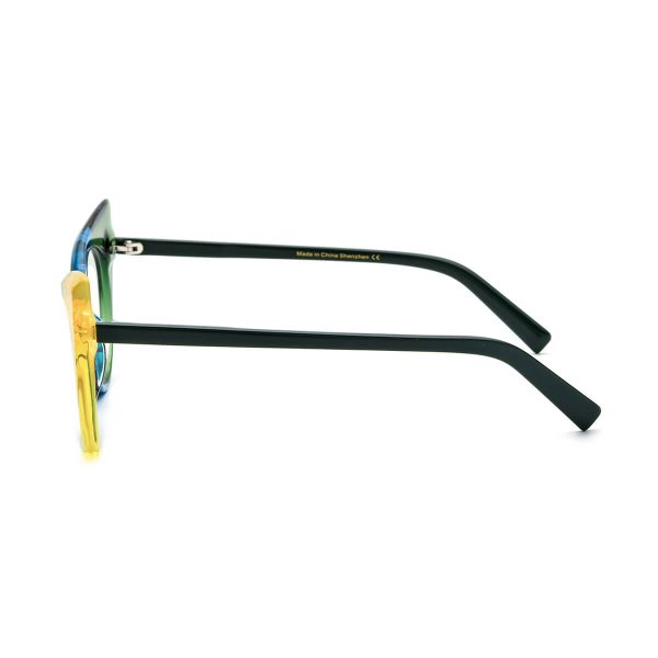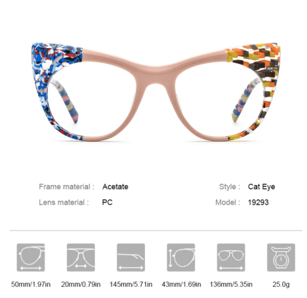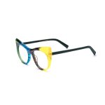 This acetate cat-eye glasses frame boasts a brand designer style, with its standout feature being the differing colors on each side of the cat-eye portion, creating a striking and cool effect. The transparent design adds a sense of lightness, enhancing its fashion-forward and modern appeal. Apart from providing optical prescription for myopia, its unique appearance can also serve as a stylish accessory. This eyewear seamlessly blends functionality with style, adding a unique charm to your look.
