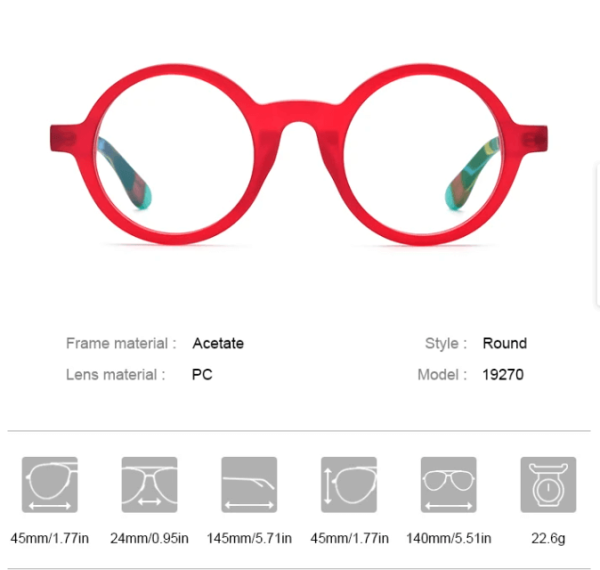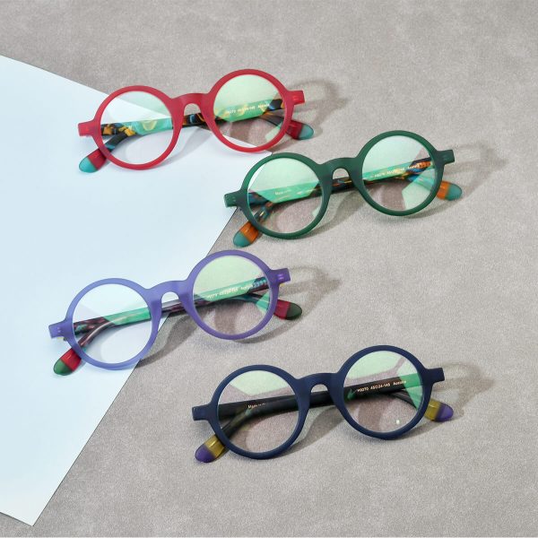This 2023 new matte acetate round glasses frame is suitable for men and also for women, showcasing a unique fashion style. The classic round design is suitable for various male face shapes, adding a unique taste to the wearer. Crafted from high-quality acetate, it is lightweight and comfortable, coupled with optical prescription, providing clear and comfortable vision. With four color options – red, green, purple, and blue, offering a diverse range of choices, it epitomizes a stylish emblem of personality and taste.